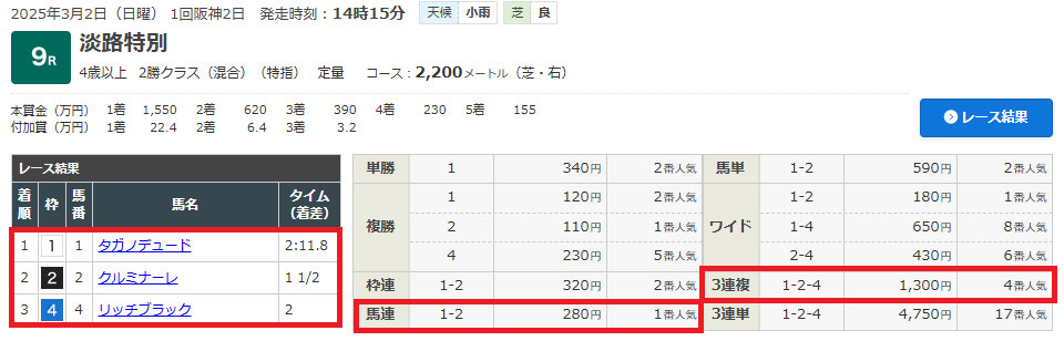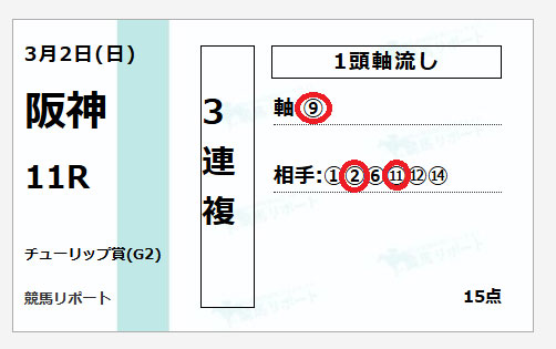競馬リポート内の「管理人田中の自腹購入の予想サイト有料情報公開」で公開したチューリップ賞(G2)の予想が見事3連単万馬券を的中していました!