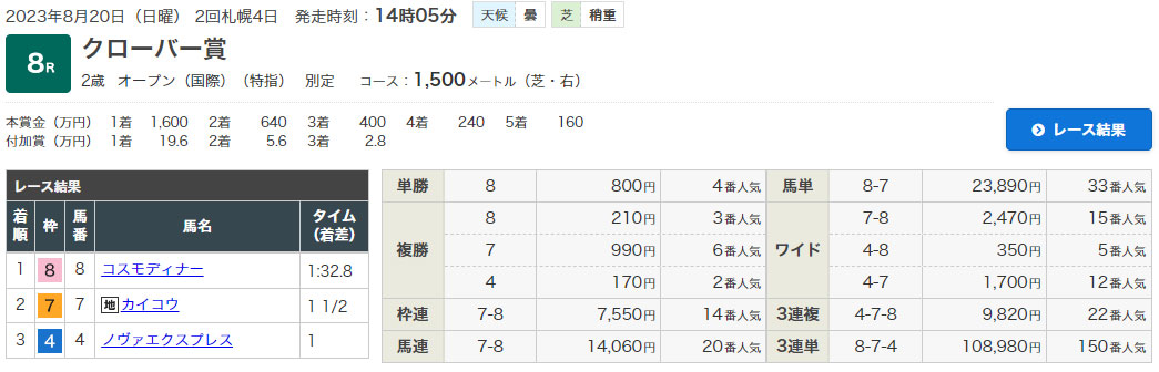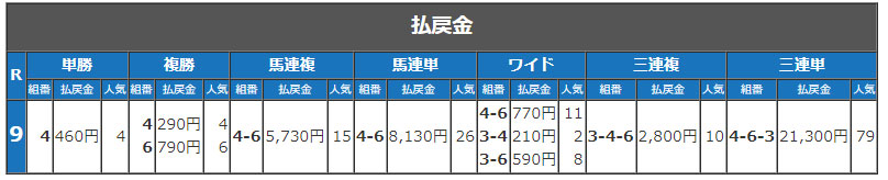 2番人気馬が絡んだものの4番人気⑧コスモデイナー、7番人気⑦カイコウが馬券内に入り3連複「98.2倍」と美味しい配当に。