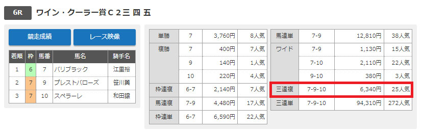 3連複「63.4倍」1点500円購入だったので、3万1700円獲得できました!