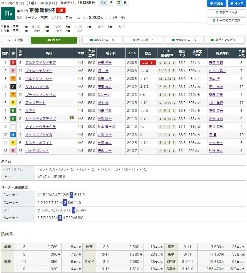 NHKマイルCも荒れましたが、土曜日のG1日本ダービーのトライアル競走、京都新聞杯(G2)も波乱決着となったが検証サイトは『超・少点数』買い目で的中を射抜いた!