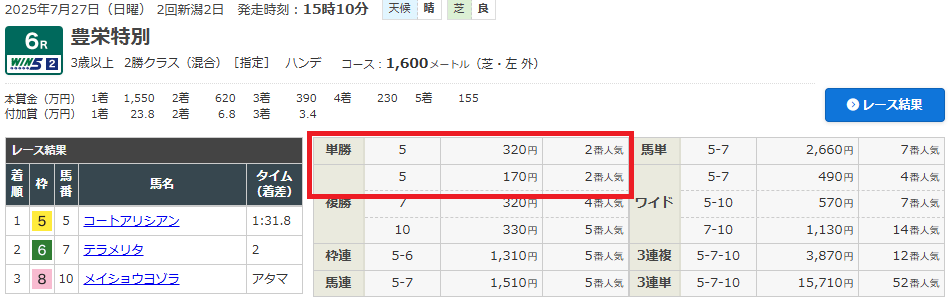 複勝単勝ともにドンピシャ的中!