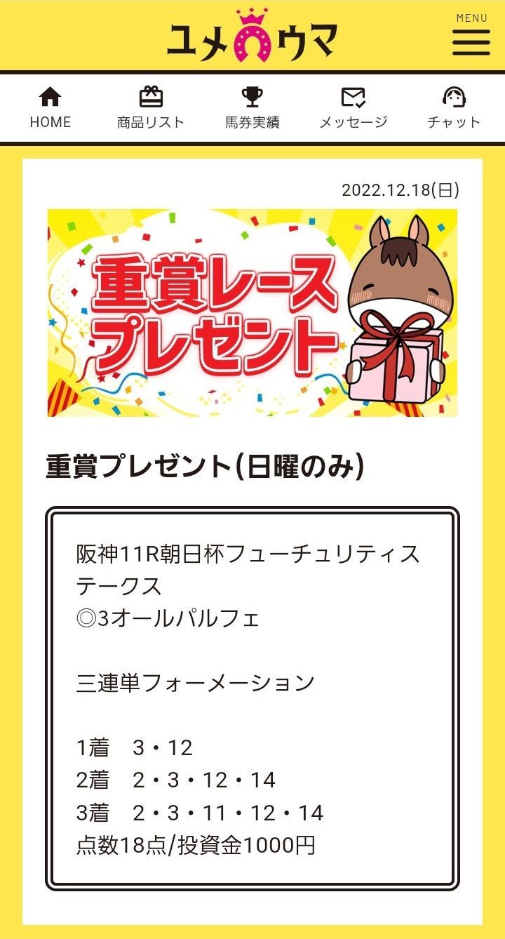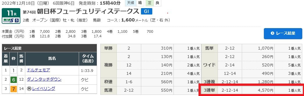 【ユメウマ】の朝日杯の予想でなくて【ユメカナウ】の無料予想2つ買ってれば107,300円になっていましたね(笑)