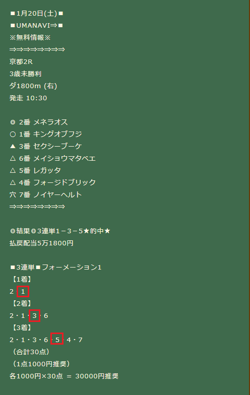 13日(土)京都2Rで無料情報「4馬券種的中」7万9600円獲得!