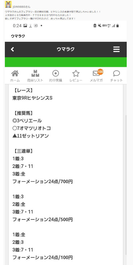 そして、フェブラリーSと同日開催、同条件の東京9RヒヤシンスSで779,800円の大的中の口コミを会員様からいただきました!!