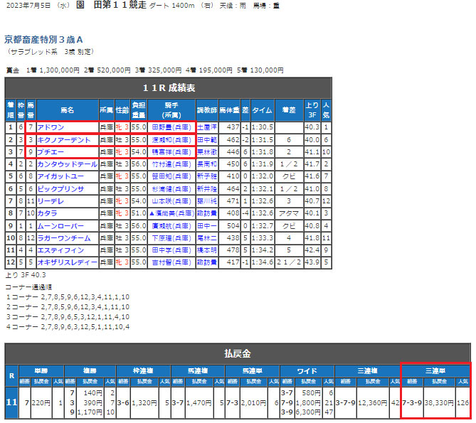 3番人気の⑧ラトワールが1着固定だったのでなんとしても勝ってほしいと思ってましたが無事に勝つことができてよかったです。