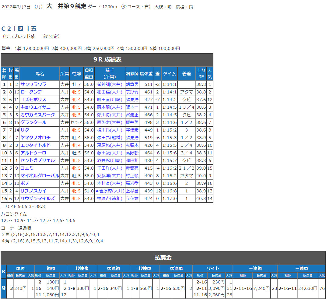 【検証レース③:3/7 大井9R C2(十四)(十五)】