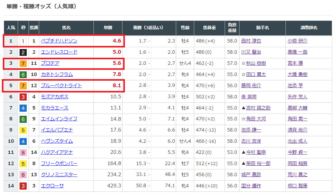 選んだ馬のオッズを見てみると