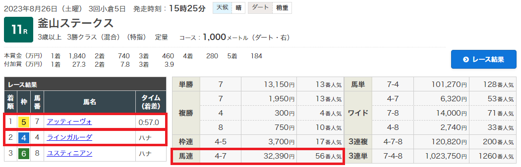 8月26日(土)小倉11Rで無料情報馬連323.9倍的中!