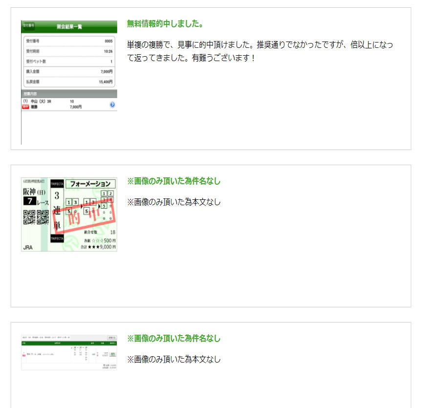 使う前にサイト内にこういう実際の会員の声や的中画像があると信用して使えますね。 最近こういう親切なサイトなくなりましたよね、使う側はこういうのが欲しいのよ!(切実)