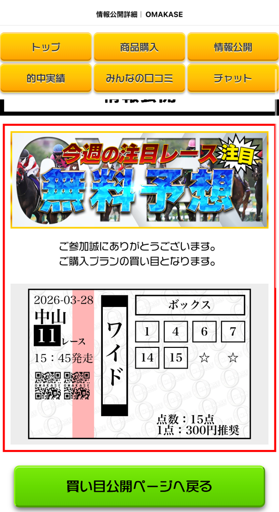 軽い気持ちで参加した無料情報だったけど日経賞【G2】ドンピシャでで当てましたね。 これなら有料でも当たるなと確信しました。 翌日はそこそこ荒れた高松宮記念的中させていたし今後使おうかなって思ったサイトの1つです、もう1つは現在ネット競馬を使っています。